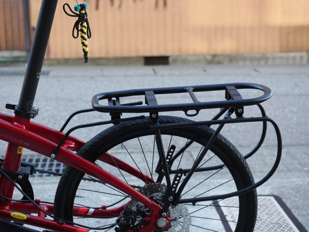 荷台はTern純正のカーゴラック。メルカリでゲットしました。これがあるとテントなどの大きい荷物も積めます。